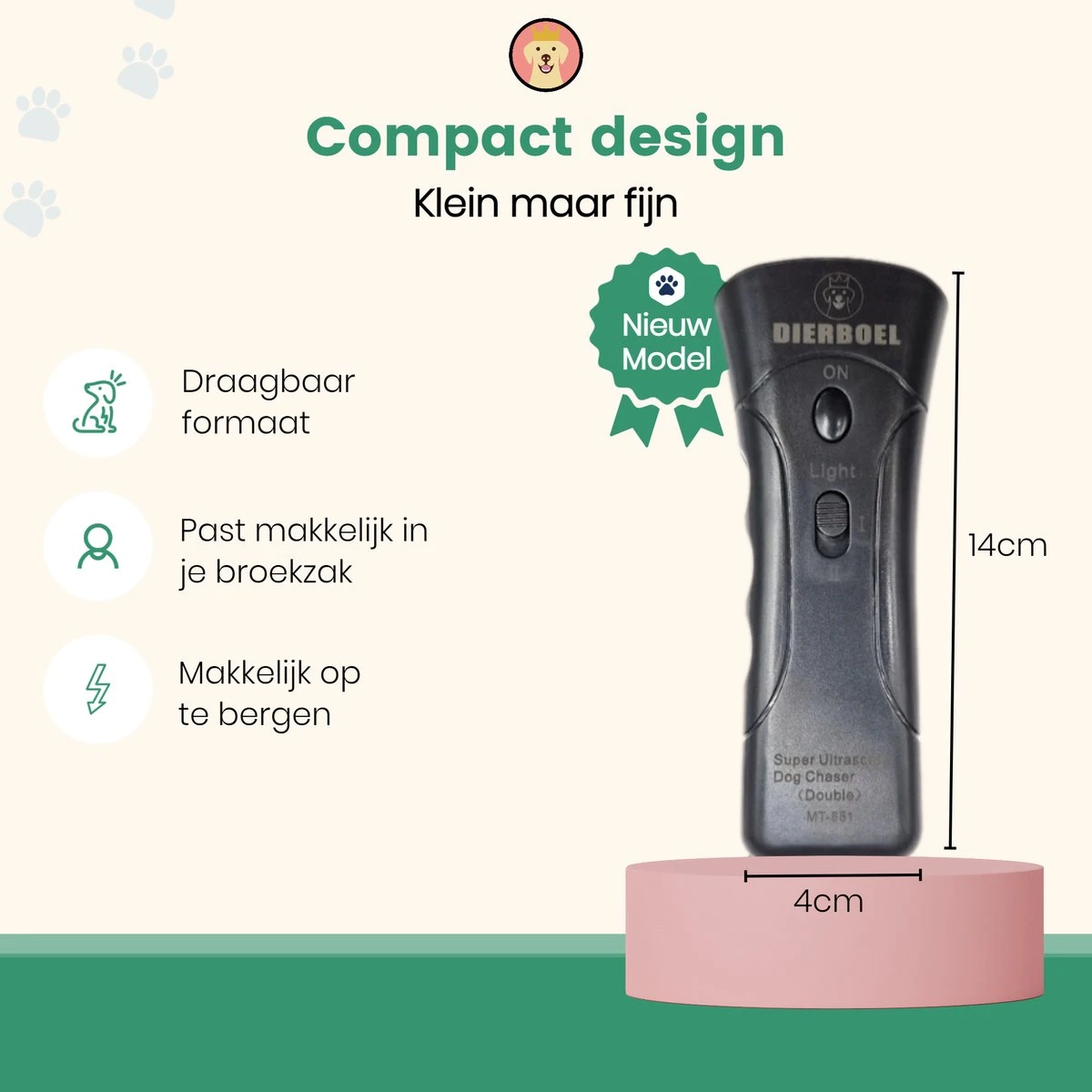 Het Dierboel anti blaf apparaat is betrouwbaar en diervriendelijk te gebruiken. Het model is voorzien van een zaklamp, een trainingsfunctie en een functie om vervelende honden weg te jagen. Het anti blaf apparaat werkt eigenlijk heel simpel. Het apparaatje maakt namelijk gebruik van ultrasone geluiden die voor mensen niet hoorbaar zijn, maar voor honden wel. Honden horen dit geluid als een vervelende hoge pieptoon. Hierdoor gaan ze beter naar commando’s luisteren, zoals het stoppen van blaffen.