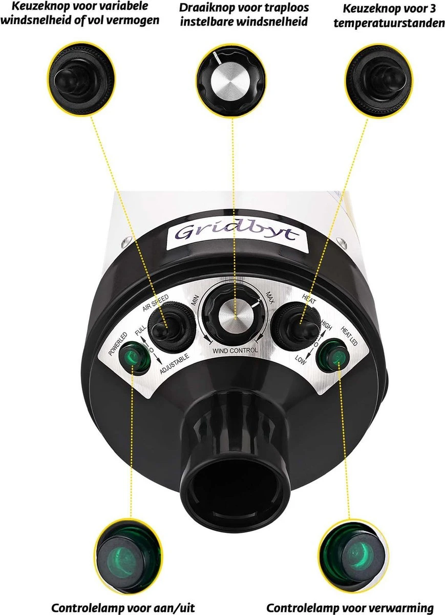 De professionele hondenföhn en waterblazer van Gridbyt. Deze hoogwaardige föhn is ‘de’ föhn voor de vacht van uw hond. Heeft de hond even een duik in het water gemaakt, of is hij helemaal nat van de regen? Met deze föhn blaast u hem gemakkelijk weer droog en schoon. Doordat de luchtsnelheid van deze krachtige föhn traploos ingesteld kan worden, kunt u met iedere gewenste snelheid de hond droog blazen. Ook is de temperatuur van de lucht instelbaar in stappen van 30℃ tot 70℃ , zodat het voor de hond een aangenaam gevoel is. Als er vuil in de vacht zit wordt dit ook zonder moeite weggeblazen. Er zullen dus na het droogblazen geen klitten en vuil meer aanwezig zijn in de vacht.