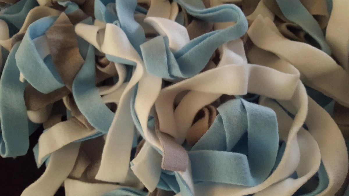 Een woef-it snuffelmat is gemaakt van fleecestroken die aan een stevige plastic mat zijn vastgemaakt.