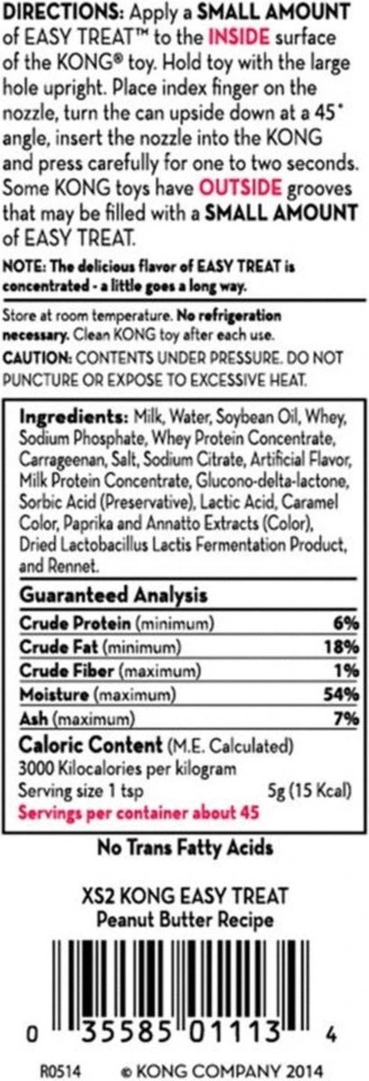 Kong Easy Treat Pindakaas is een heerlijke traktatie die alle soorten honden vermaakt terwijl het een gemakkelijke oplossing biedt voor baasjes. Deze licht verteerbare en transvetvrije traktatie is gemaakt in de VS en een verleidelijk lekkere toevoeging wanneer deze wordt toegevoegd aan een gevulde Kong. Een uniek ontworpen spuitmond regelt gemakkelijk de hoeveelheid Kong Easy Treat en heeft bovendien het extra voordeel van een handige, knoeivrije oplossing.