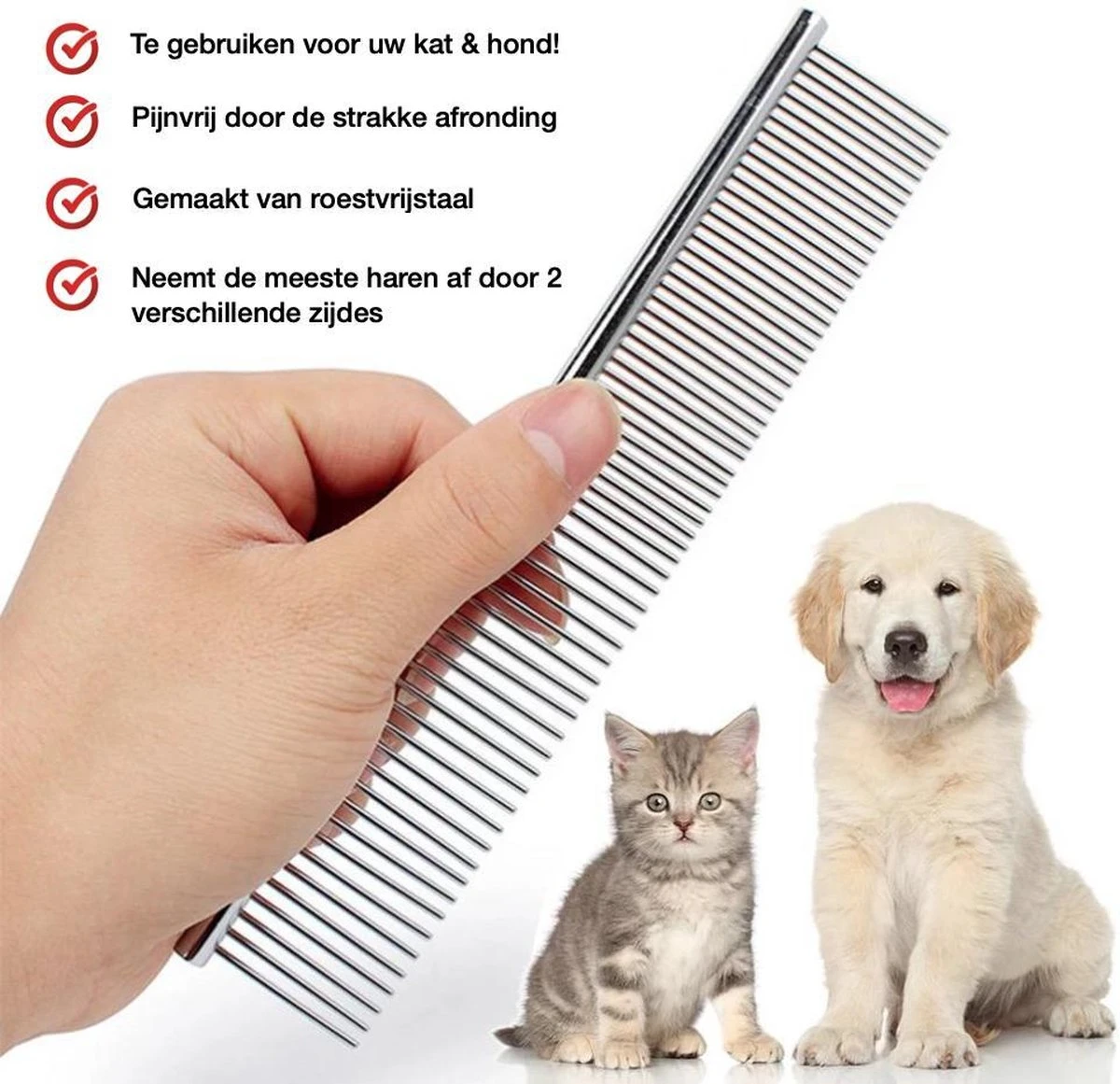 Multifunctioneel – Door de verschillende mogelijkheden die je met deze kam hebt kun je al je huisdieren met een kam pijnloos en efficiënt kammen. Erg robuust en slijtvast waardoor hij jaren lang te gebruiken is.