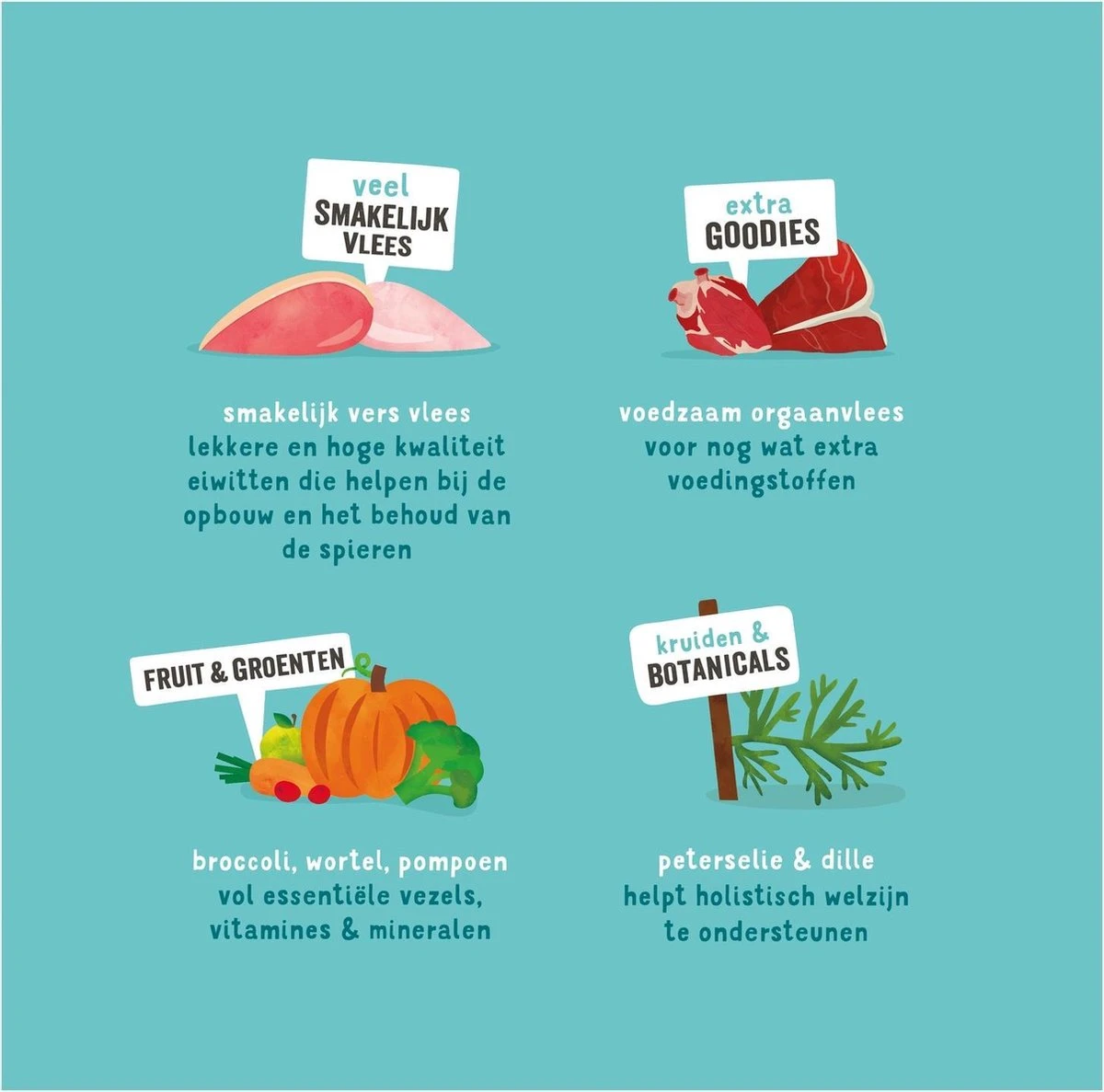 Samenstelling: kip 30%, kalkoen 26%, mineralen, wortels 2%, cranberry’s 1%, tomaten 1%, pompoen 1%, appels 1%, peterselie 0,1%, dille 0,1%.