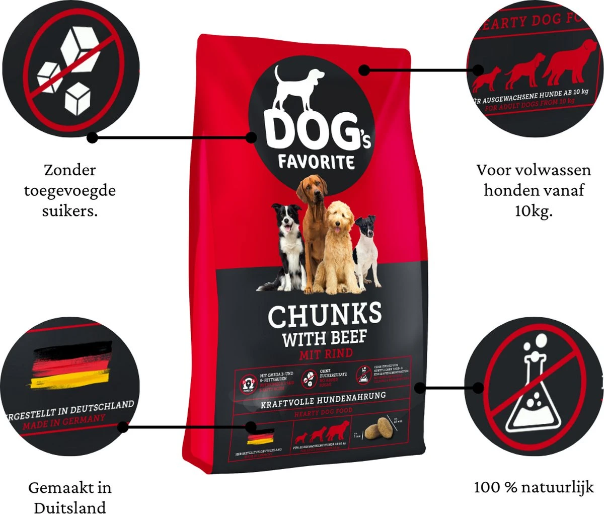 Jouw hond zal dol zijn op deze evenwichtige en natuurlijke voeding die hem van alle essentiële voedingsstoffen voorziet. De crunchy chunks bevatten hoogwaardige ingrediënten zoals heerlijke rund. Rund voorziet jouw hond van hoogwaardige dierlijke eiwitten, waardevolle omega 3 en omega 6 vetzuren bevorderen een glanzende vacht. Dit uitgebalanceerde en smakelijke hondenvoeding van hoge kwaliteit is perfect voor volwassen honden met een normaal activiteitsniveau.