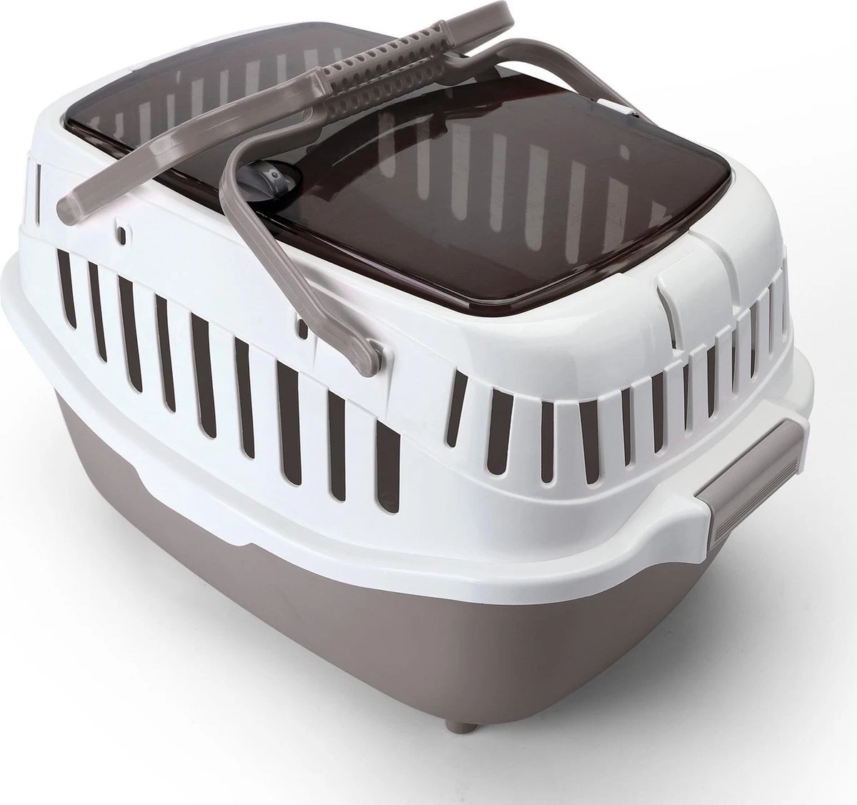 Draagbaar reishuis voor huisdieren. Het bovenste dakraam is goed afsluitbaar en eenvoudig te openen om je hondje of kat in te laden.