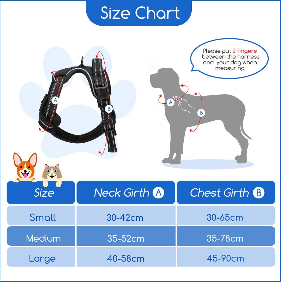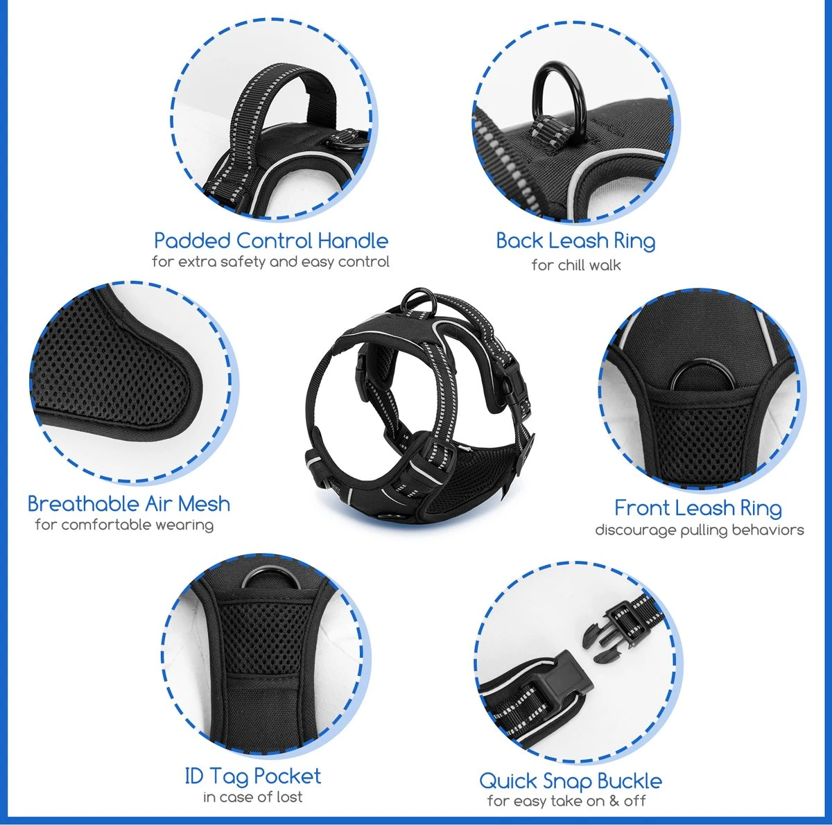 Neopreen gevoerde bedieningshendel en 2 ringen voor betere controle; 4 Afstel punten voor bijna aangepaste pasvorm; Snelle klikgespen voor gemakkelijk aan- en uittrekken; Zak voor ID-tag voor het plaatsen van ID-tags en zorgt ervoor dat uw huisdieren veilig thuiskomen.