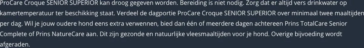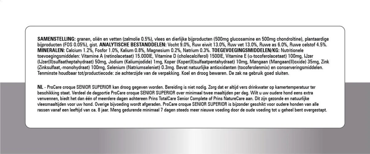 ProCare croque senior Superior is een hoogwaardige voeding die ondersteuning biedt aan jouw hond op leeftijd. Een verlaagd eiwitgehalte en aangepaste hoeveelheid mineralen ontlasten de nieren. Door de toevoeging van glucosamine en chondroïtine wordt het kraakbeen extra ondersteund en de gewrichten soepel gehouden. De natuurlijke vezels die in de voeding zitten dragen bij aan een optimale stofwisseling en handhaving van het juiste gewicht waardoor je oudere hond zich prima kan blijven bewegen.