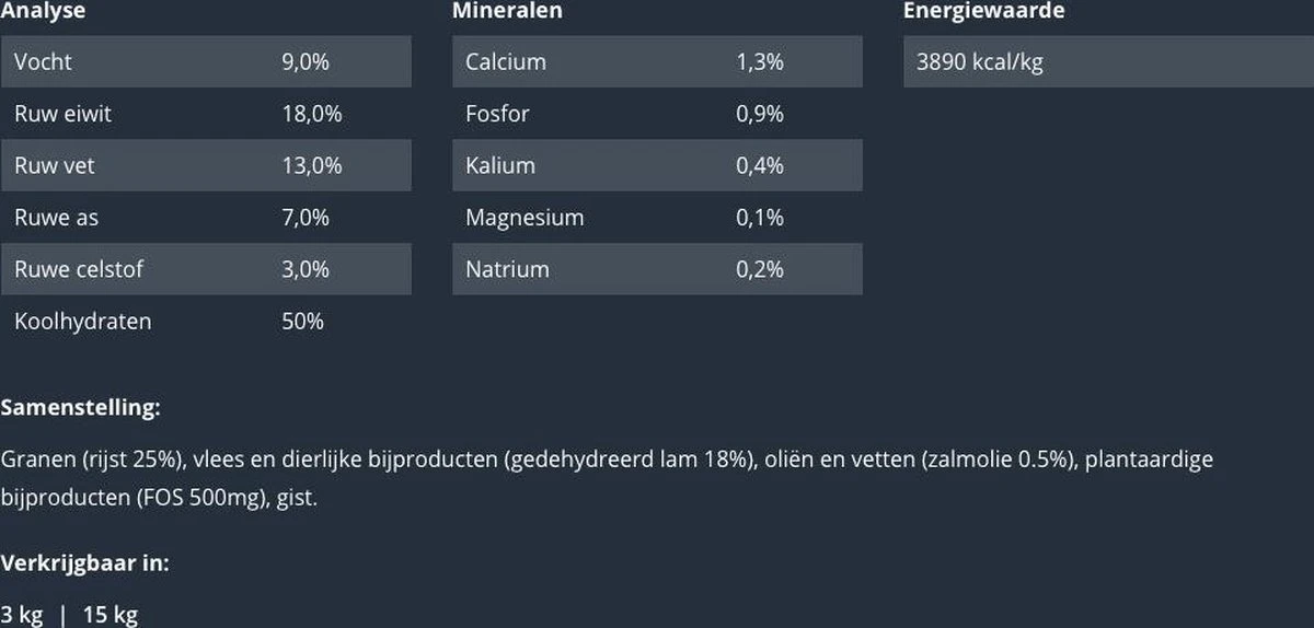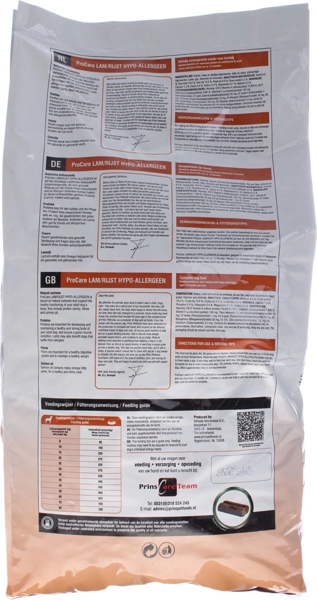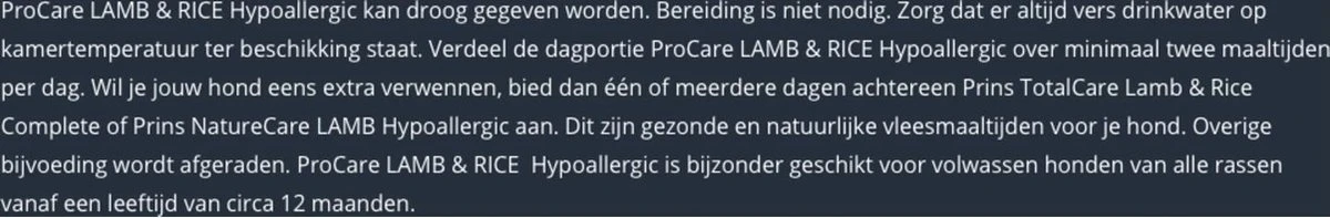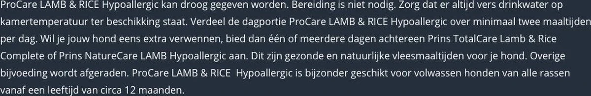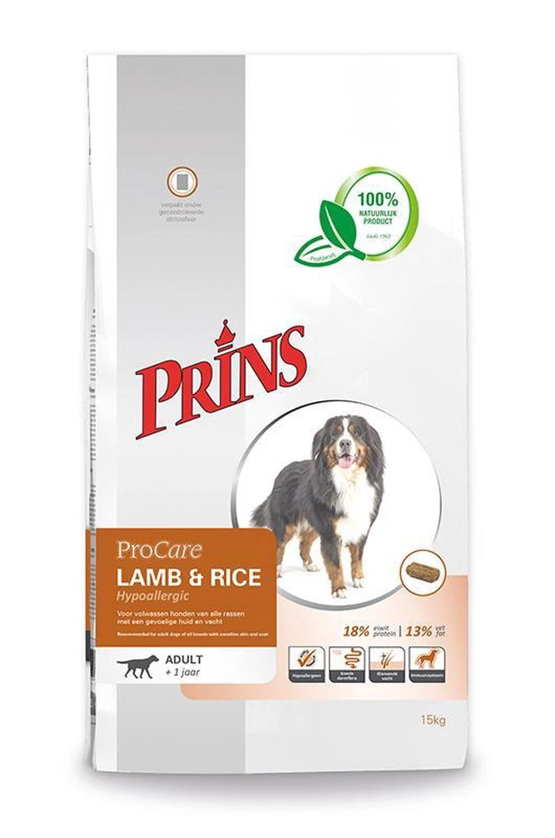 ProCare LAM/RIJST is een hoogwaardige voeding geschikt voor honden met allergische klachten. Het gebruik van nieuwe eiwitbronnen beperkt de kans op een allergische reactie die tot uiting kan komen als spijsverteringsproblemen en/of huidproblemen. Daarom is er in deze voeding gebruik gemaakt van uitsluitend kwalitatief hoogwaardig lamsmeel, welke ondersteuning biedt aan honden die allergisch reageren op andere eiwitbronnen. Vezels bevorderen de gezondheid van de darmen. ProCare LAM/RIJST bevat géén tarwegluten.