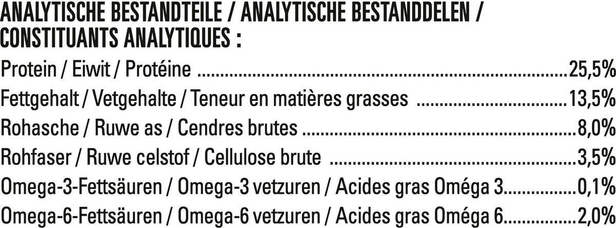 | Analytische bestandsdelen | Eiwit: 25,5%, Vetgehalte: 13,5%, Ruwe as: 8%, Ruwe celstof: 3,5%, Omega 3-vetzuren: 0,1%, Omega 6-vetzuren: 2,0%. |