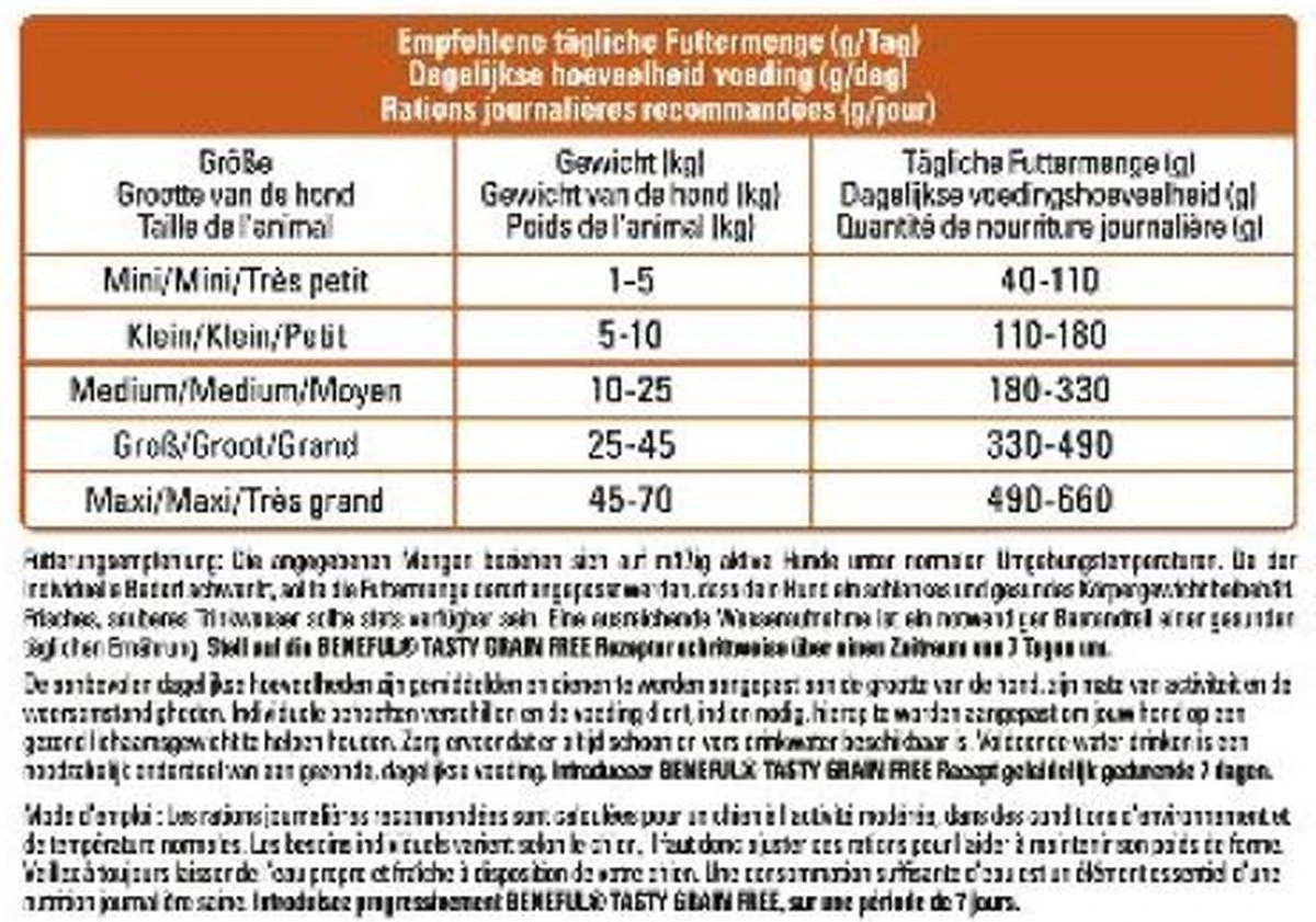| Voedingsadvies | De aanbevolen dagelijkse hoeveelheden zijn gemiddelden en dienen te worden aangepast aan de grootte van de hond, zijn mate van activiteit en de weersomstandigheden. Individuele behoeften verschillen en de voeding dient, indien nodig, hierop te worden aangepast om jouw hond op een gezond lichaamsgewicht te helpen houden. Zorg ervoor dat er altijd schoon en vers drinkwater beschikbaar is. Voldoende water drinken is een noodzakelijk onderdeel van een gezonde, dagelijkse voeding. Introduceer BENEFUL® TASTY GRAIN FREE Recept geleidelijk gedurende 7 dagen. |