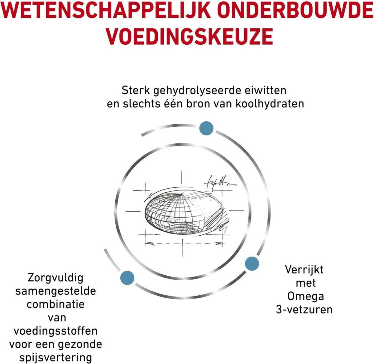 De eiwitbron is hydrolysaat van geïsoleerd soja-eiwit. Royal Canin Hypoallergenic is hypoallergeen (lokt zelden een overgevoeligheidsreactie uit) en zeer licht verteerbaar. De samenstelling zorgt ervoor dat het waterverlies via huid minimaal is en dat de beschermende functie van de huid versterkt wordt. Omega-3-vetzuren (EPA/DHA) hebben een specifieke werking hierbij. De combinatie van Fructo-Oligo-Sacchariden (FOS) en zeoliet (een specifiek mineraal) bevordert een evenwichtige darmflora en helpt de darmwand te beschermen. Royal Canin Hypoallergenic is gluten- en lactosevrij.