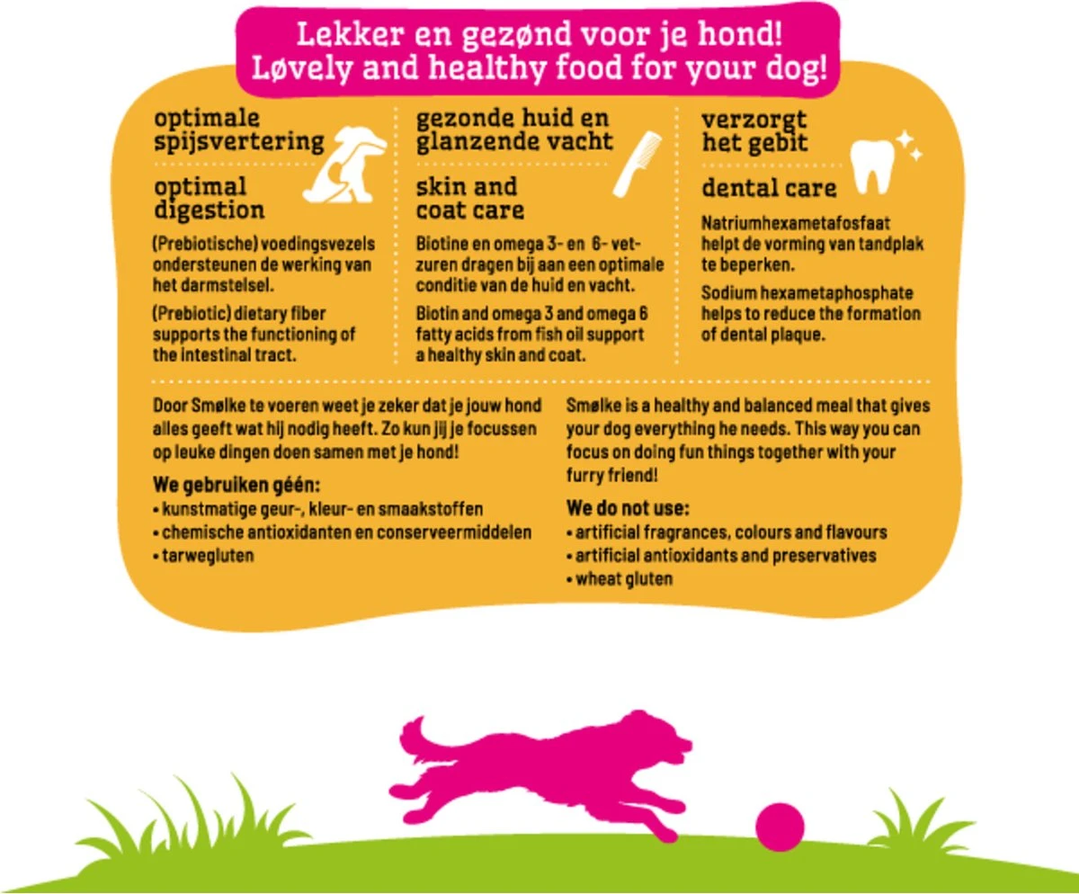 Smølke Adult Mini is een complete Alles-in-één hondenvoeding afgestemd op de behoefte van kleine volwassen honden vanaf tien maanden met een maximaal gewicht van ca. 10kg. De voeding is samengesteld zonder tarwegluten en is optimaal verteerbaar doordat o.a. (prebiotische) voedingsvezels de darmwerking ondersteunen. Smølke Adult Mini is gemaakt met natuurlijke ingrediënten en heeft een uniek eiwitprofiel bereid met Nederlandse kip, MSC vis en Brits lam. Daarnaast zijn de brokjes natuurlijk van klein formaat en érg smakelijk. Smølke Adult Mini is een gezonde en gebalanceerde voeding die iedere dag weer zorgt voor een blije en tevreden hond. Natuurlijk zonder kunstmatige geur-, kleur- en smaakstoffen en chemische antioxidanten!