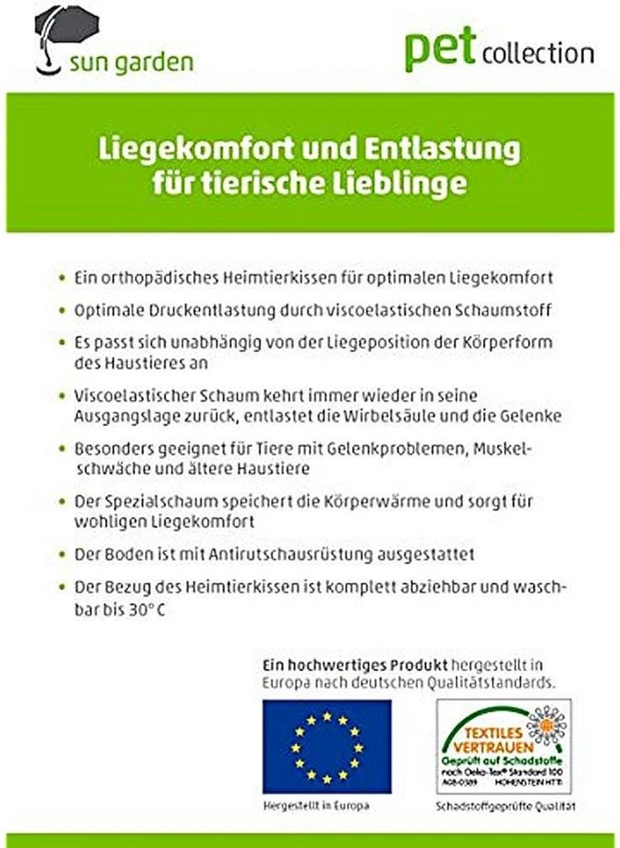 Het Duitse bedrijf Sun Garden, bekend van o.a. kwaliteitsmatrassen en boxsprings heeft nu ook luxe kleden en (orthopedische) kussens voor huisdieren ontwikkeld. Uw hond kan heerlijk ontspannen liggen op het orthopedisch hondenkussen Buddy. Het kussen geeft een optimale drukontlasting voor de wervelkolom en de gewrichten.